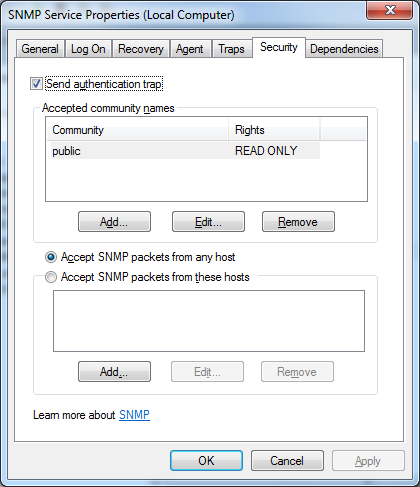 打开“服务/SNMP”,选择“安全”选项卡,确保至少有一个社区名称。 如果其他主机需要访问该SNMP服务,请勾选“接受来自任何主机的SNMP数据包”。